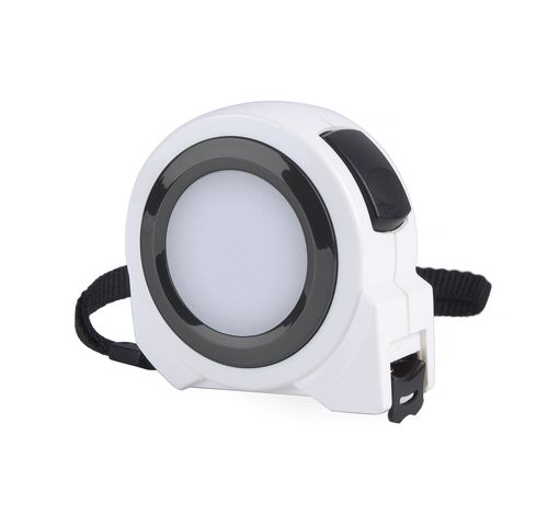 Рулетка округлої форми Step в білому корпусі з кольоровими вставками.